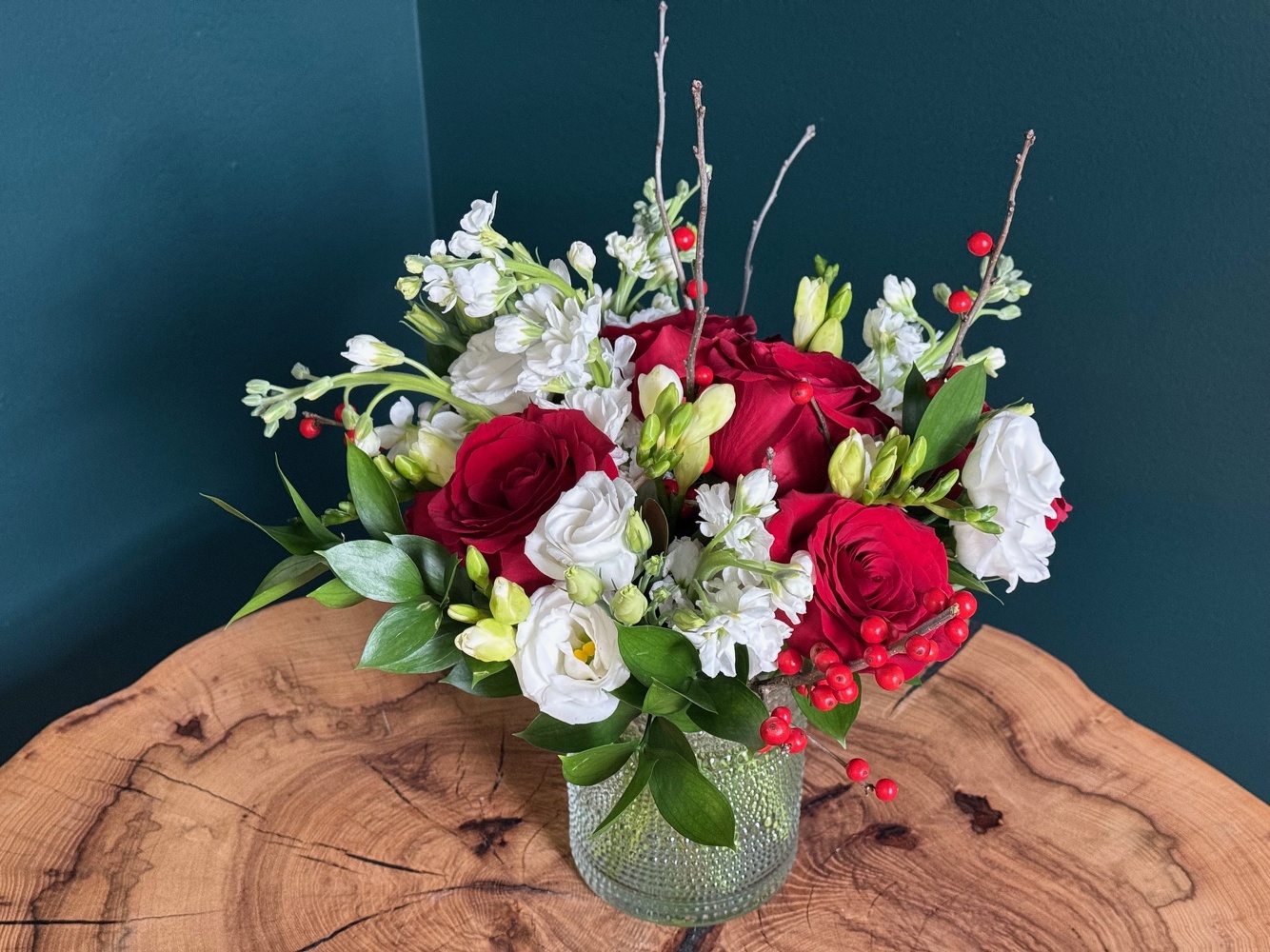 roses, berries, lisianthus, freesia, stock in a petite glass vase